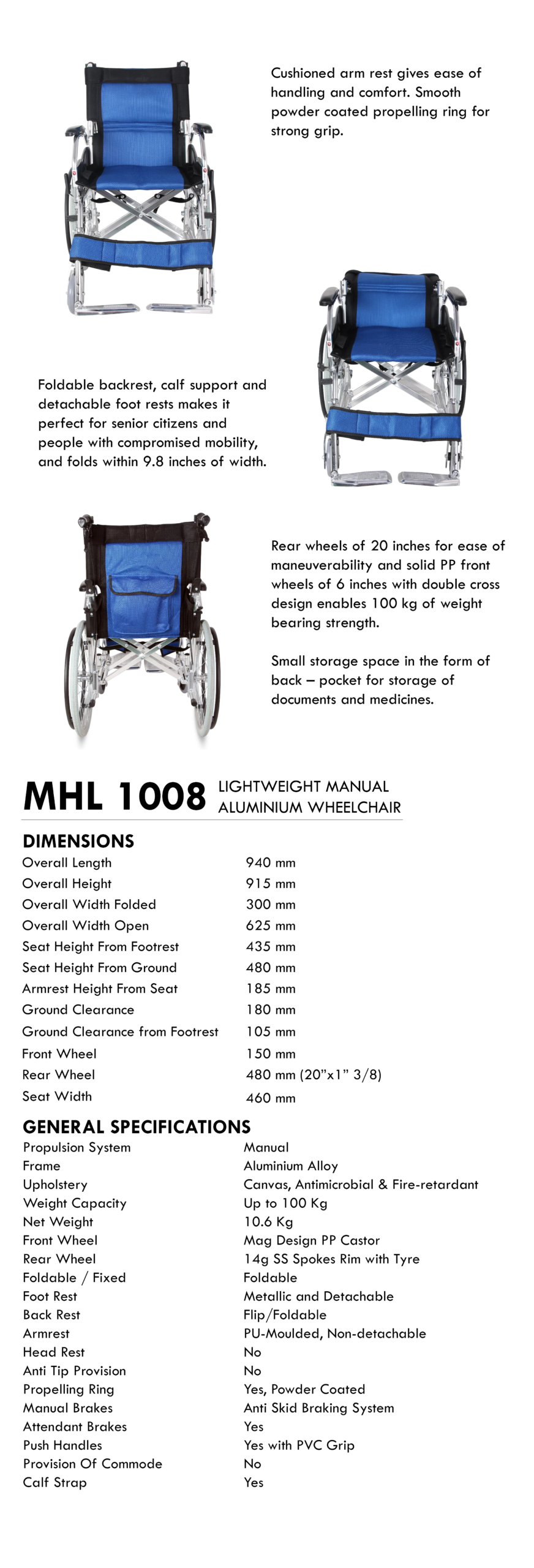 MHL 1002 AX is ergonomically designed chrome plated wheelchair with strong, flexible and
