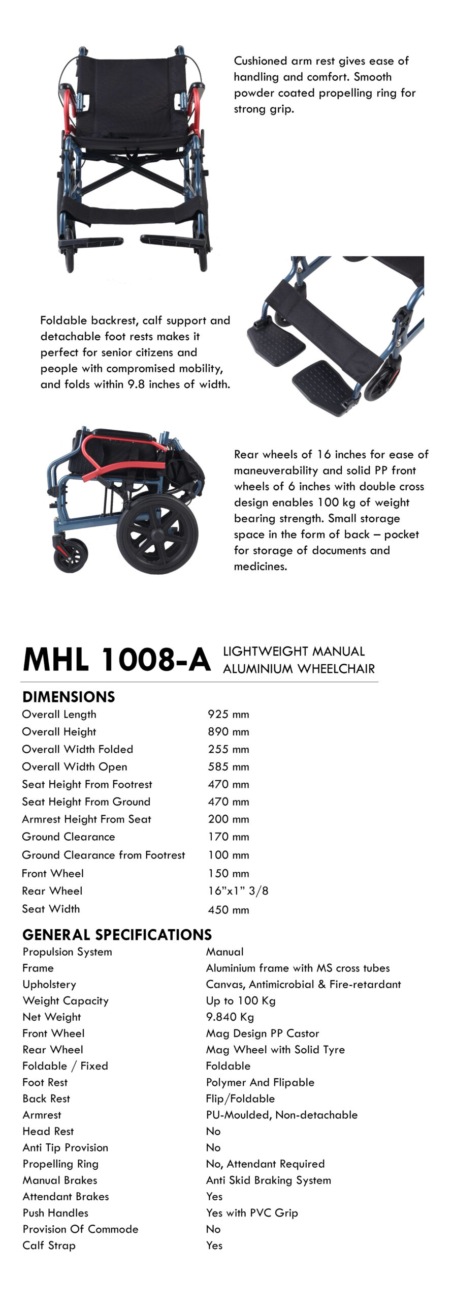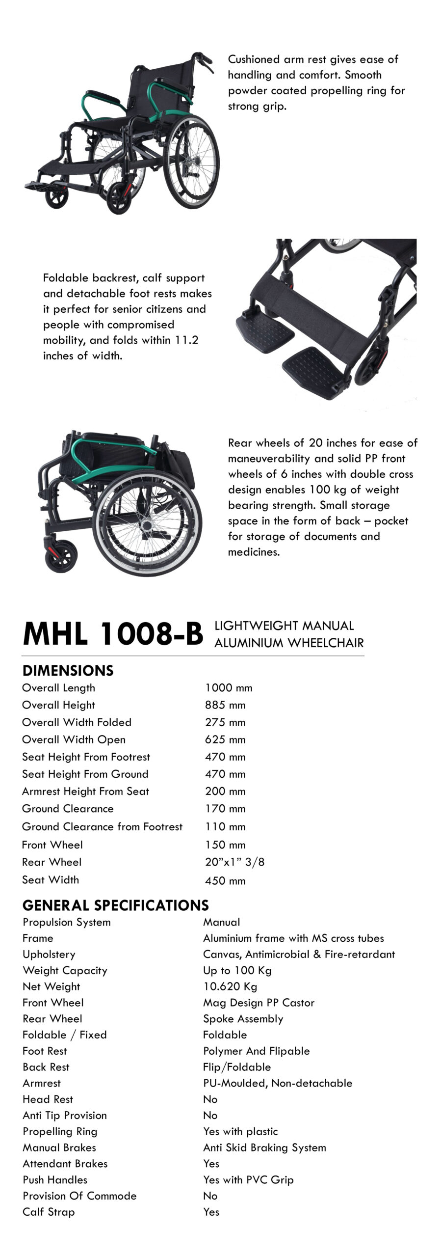 MHL 1002 is ergonomically designed black powder coated wheelchair with strong, flexible and