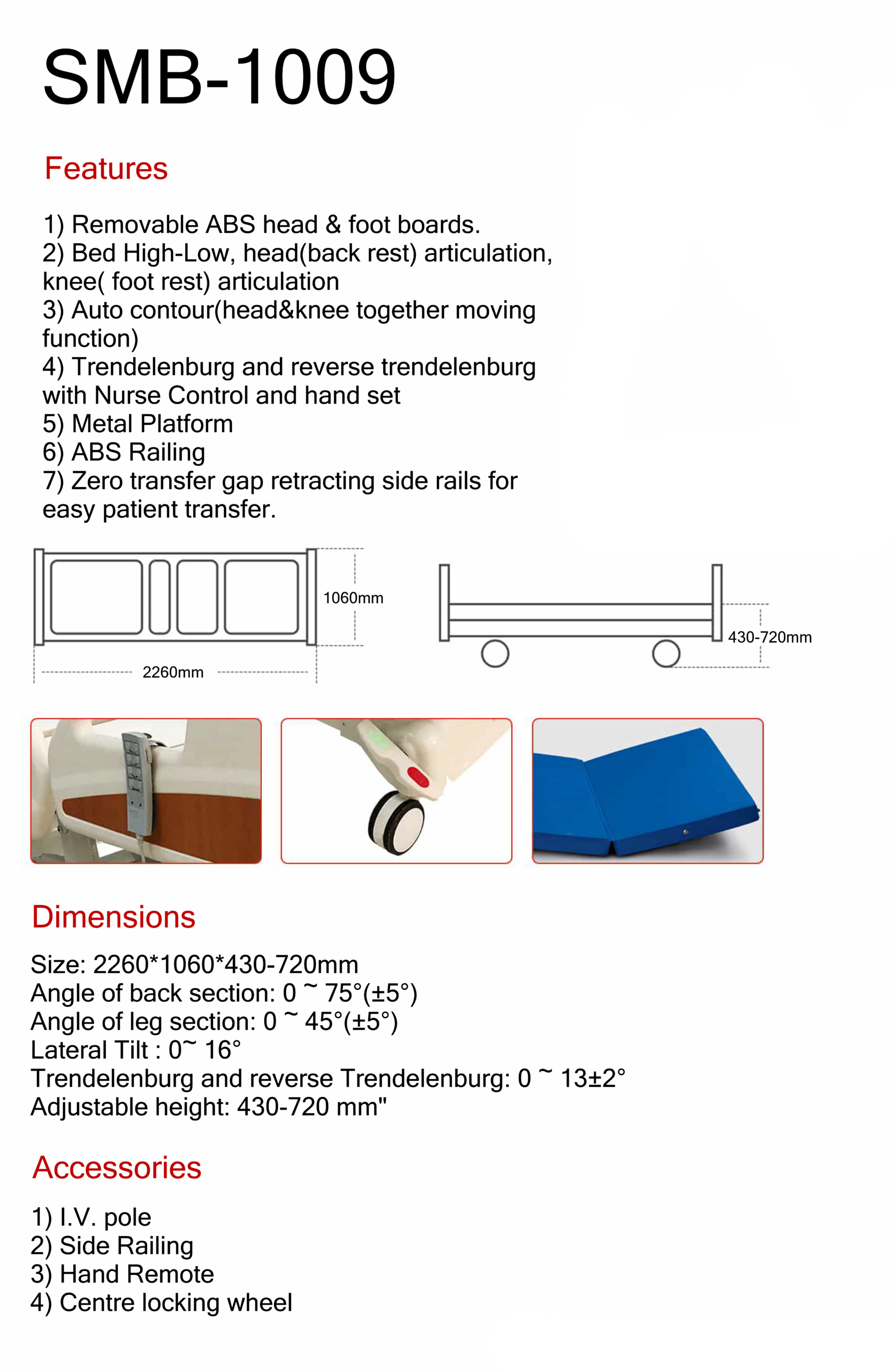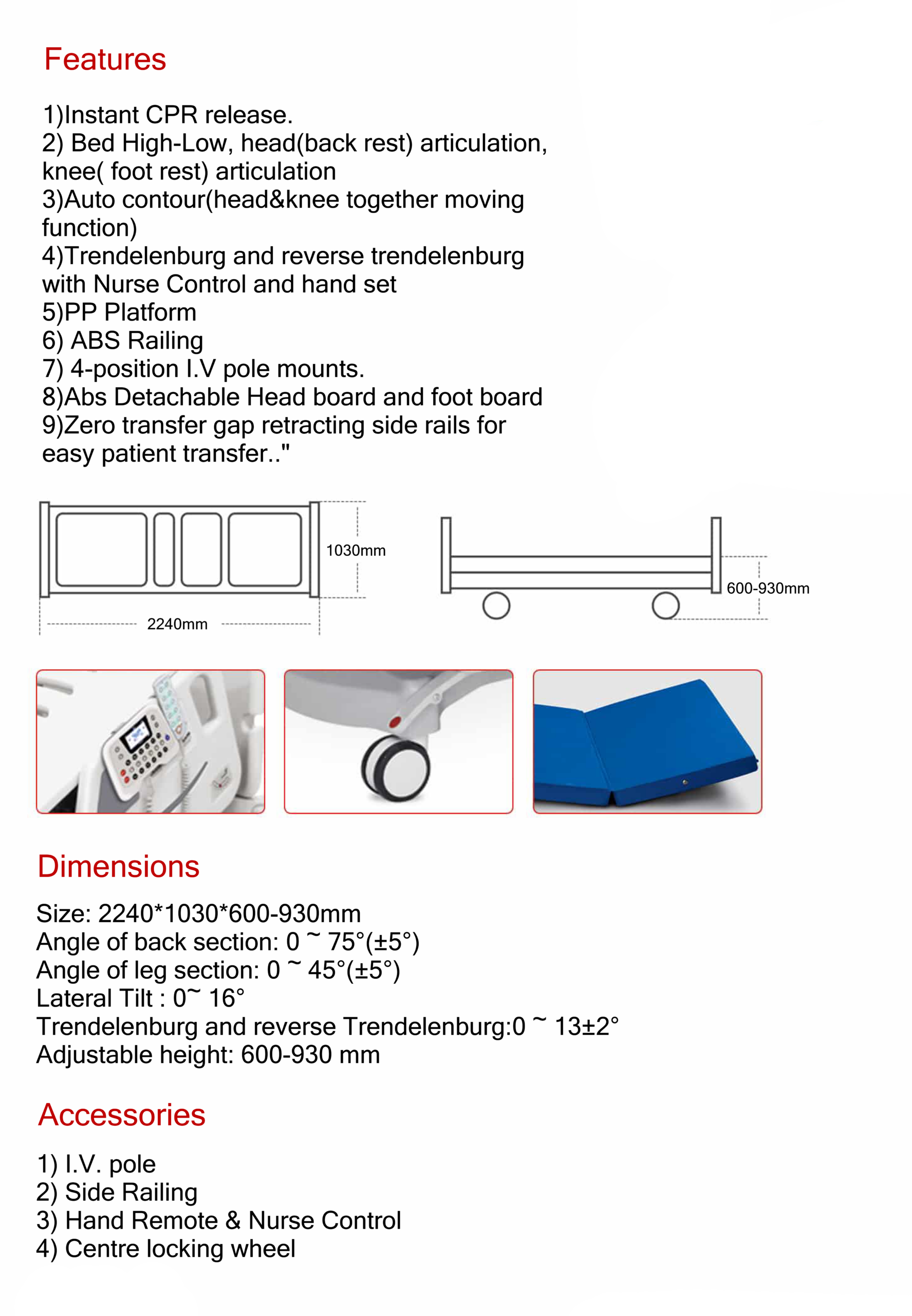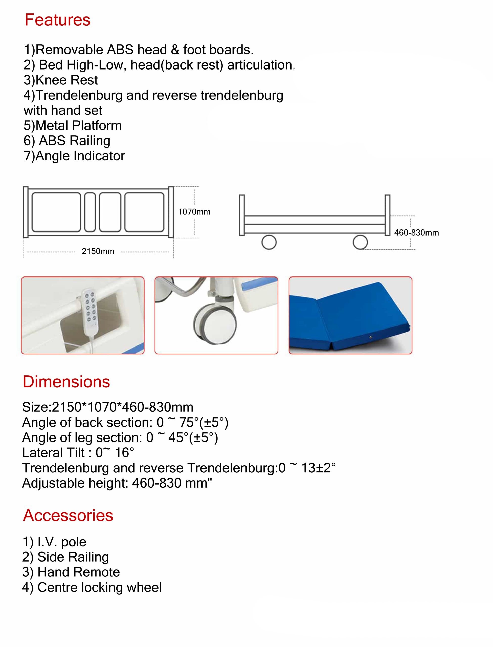 4) Trendelenburg and reverse trendelenburg with hand set