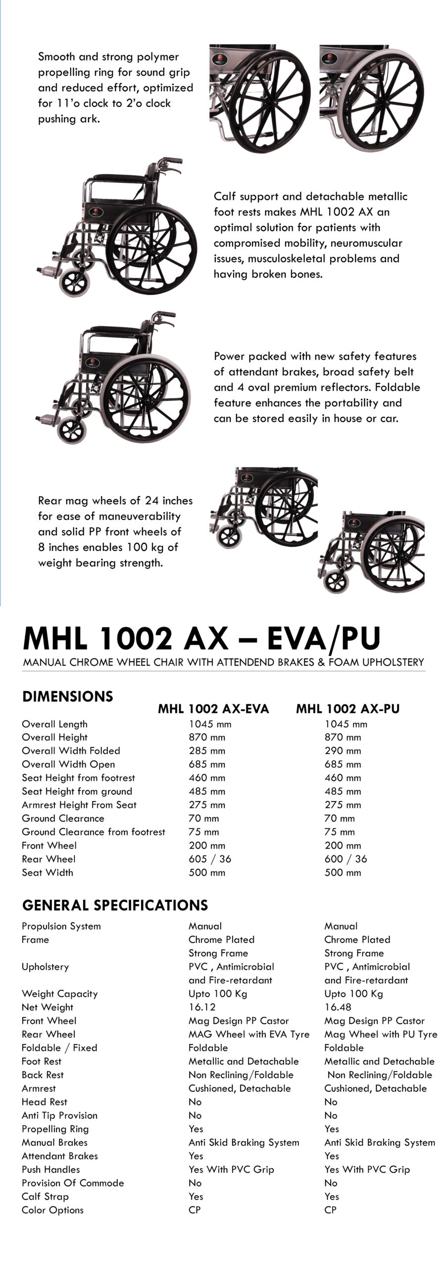 MHL 1002 AX is ergonomically designed chrome plated wheelchair with strong, flexible and
