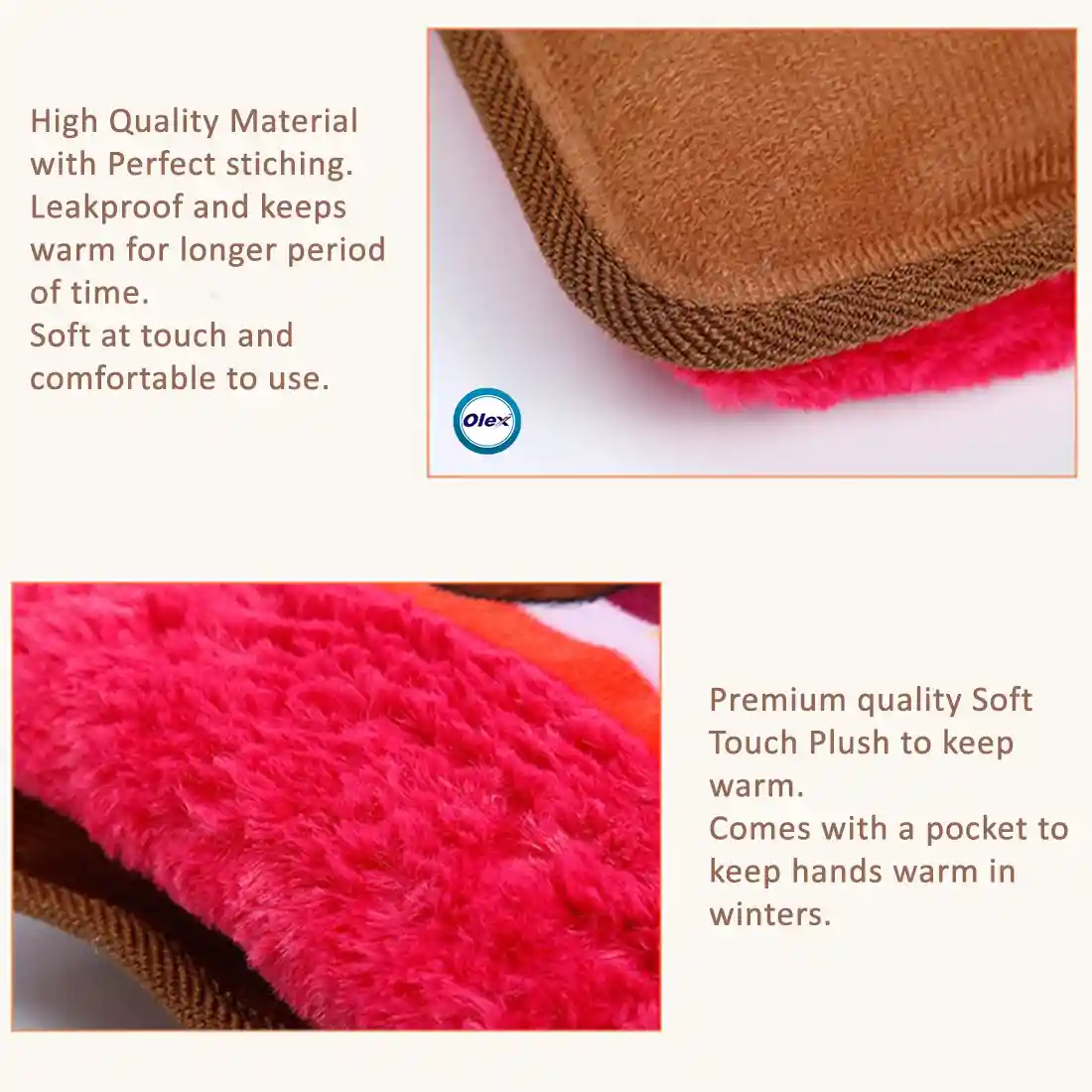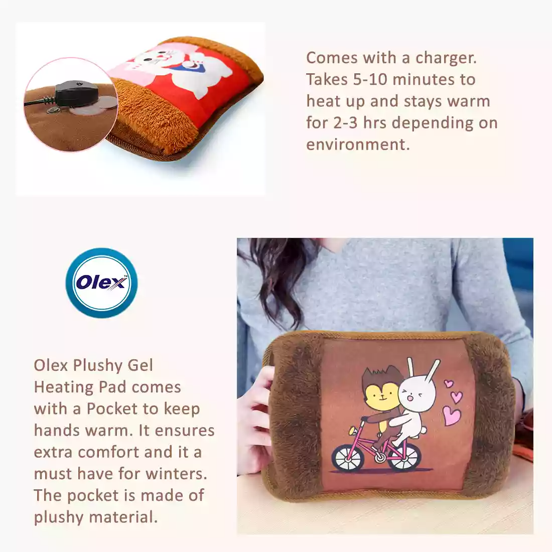 Olex Plushy Gel Heating Pad a high-quality hot bag with Fur and velvet surface. Fur helps in retaining the heat for a longer time and also the gradual release of heat. Note: Its artificial fur and not animal fur. The problem with cheaper hot water bags is that it’s too hot when just heated, so you need to use a towel etc. to reduce the heat. And suddenly it’s cold. Our high-quality hot water bags do not have this issue. It’s much is more comfortable to use than the cheaper bags with rexine or polyester materials. ? Color and design are subject to availability as per stock. Please note: Rechargeable means that the device can be connected to electricity to heat the water inside. There is no battery inside. Hence no risk of electric shock. It’s perfectly safe to use.