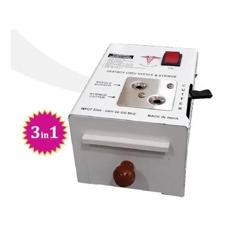 Needle Syringe Destroyer with 3 in 1 operation in single body i.e. burning of needle cutting of syringes and manual cutting of needle are also provided in case of electricity failure. Our machine has strong metal body with powder coating for longer life.